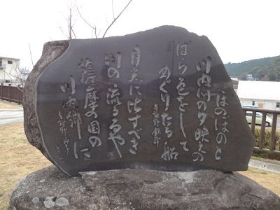 散歩途中の眺め_3 新着情報 2021.01.17 歌碑 ほのぼのと 川内川の 夕映えのばら色をして めぐりたる船 【与謝野鉄幹(寛)】 月光に 比すべき川の 流るるや薩摩の国の 川内郷に 【与謝野晶子】 昭和4年夏 山本實彦の招きで 川内を訪れた